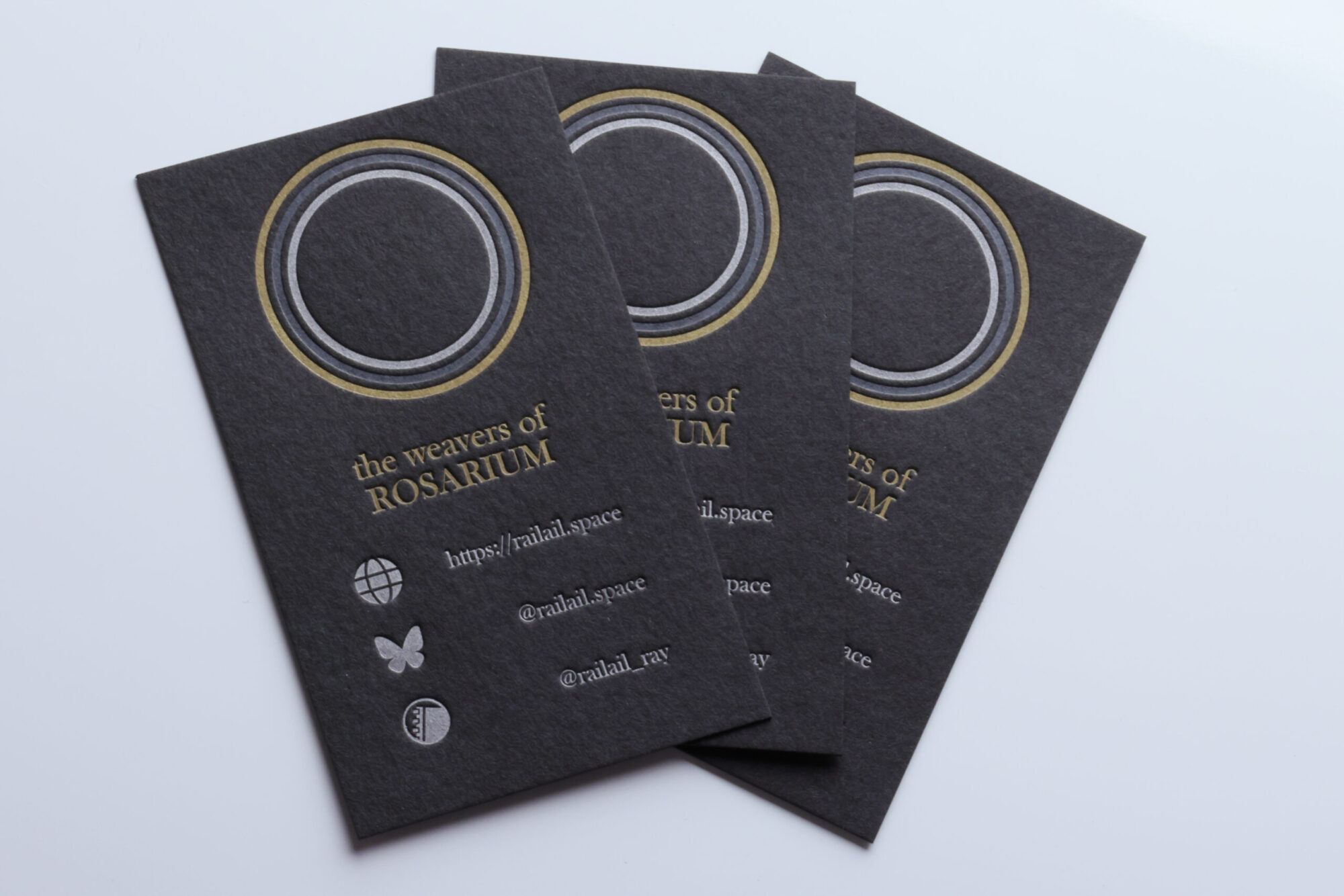 活版印刷のショップカードを黒紙に3色で請け賜わりました。